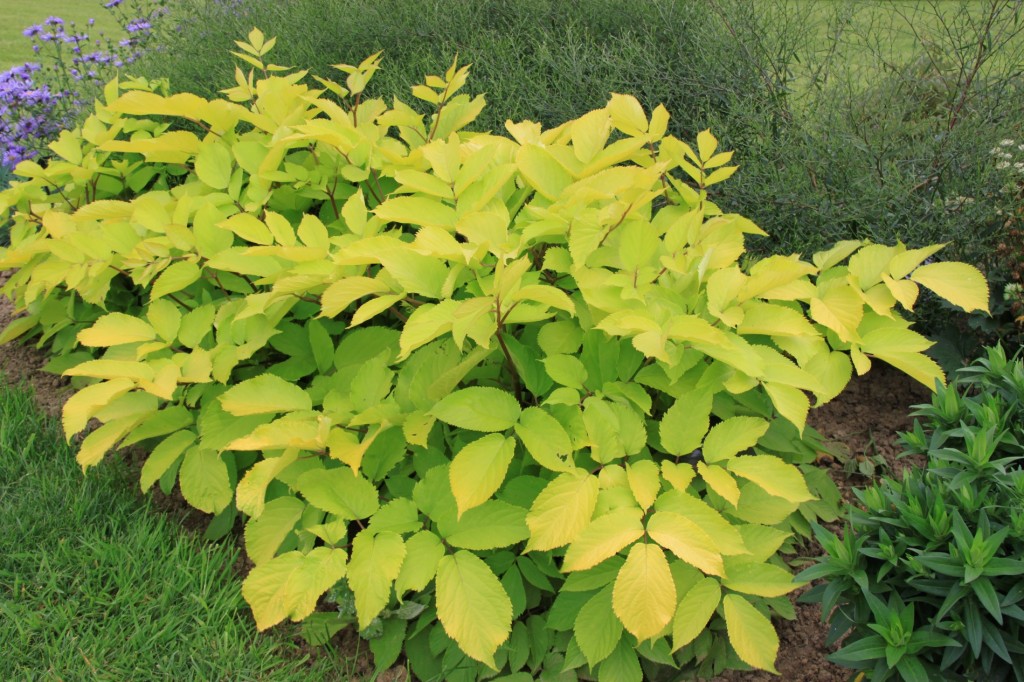 Трвянистый многолетник, образующий густую куртину, высотой до 60см. Побеги гладкие, коричневые, листья очень декоративные, крупные, остроконечные, очередные, дважды и трижды перистые, зубчатые. На солнечном месте листья золотисто-желтые, в тени салатово-зелёные. Цветение достаточно красивое, обильное и продолжительное с начала июля. Прекрасный медонос. Цветы слегка душистые, мелкие, белые, с длинными тычинками, многочисленные, собраны в крупные, зонтичные соцветия. После цветения завязываются небольшие, декоративные, фиолетово-чёрные, плоды, которые долго украшают растение. Растёт довольно быстро, неприхотлива, положительно относится к плодородным, в меру сырым почвам, зимует без укрытия. Зона зимостойкости 3 (до -37°С).