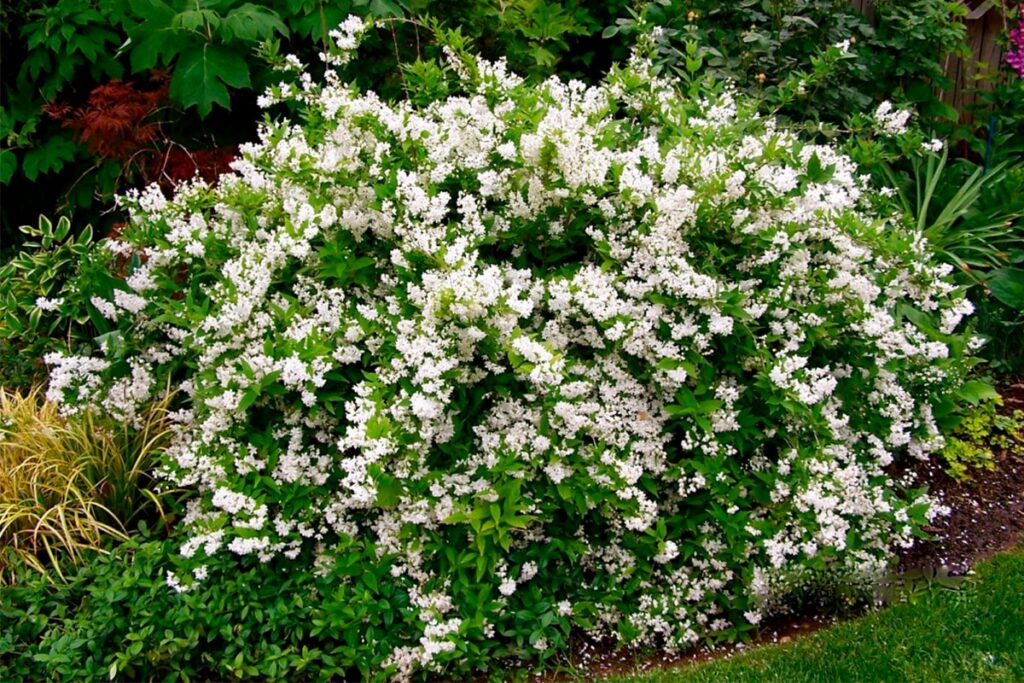 Высота кустов дейции варьируется от 40 см у карликовых сортов до 2,5–3 метров у высокорослых видов. Особой популярностью у садоводов пользуются компактные формы до 1–1,5 м — их удобно размещать как в цветниках, так и в контейнерах. Цветение обильное и продолжительное (до 20–25 дней). Соцветия собраны в изящные кисти или метёлки. Оттенки лепестков разнообразны: от ослепительно-белого и нежно-розового до насыщенного карминового. В период цветения куст буквально усыпан звездчатыми или колокольчатыми цветками. В саду, где растут дейции, особенно ценятся сорта 'Candidissima' (махровая белая) и 'Strawberry Fields' (малиново-розовая), которые сохраняют декоративность даже в полутени. Помимо дейции, в композициях можно видеть розу, вейгелу и чубушник, дополняющие общую красоту ансамбля.