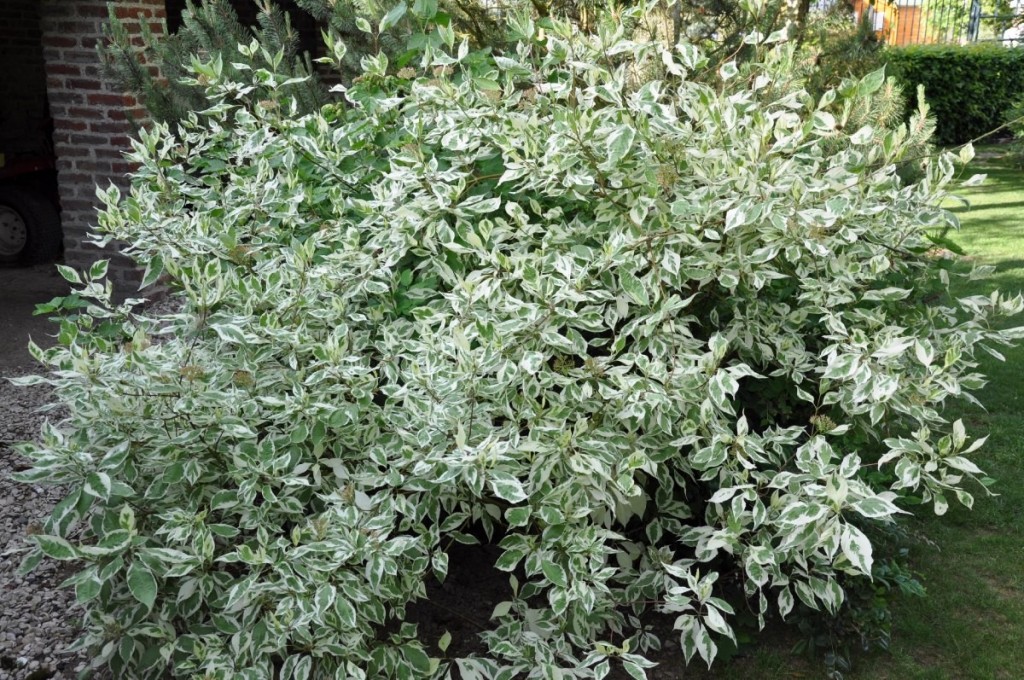 Дерен белый “Элегантиссима” Неприхотливый, зимостойкий, листопадный, кустарник высотой и диаметром до 3 метров. Листья овальные широкие, с оттянутыми кончиками, c неравномерной широкой бело-кремовой каймой, несколько морщинистые, снизу – сизовато-белые. Осенью окрашиваются в фиолетово-красный цвет. Цветки мелкие, розовато-белые, собраны в многочисленные щитковидные соцветия. Плоды – несъедобные шаровидные костянки желтоватой или синевато-белой окраски. Цветет в начале лета, часто осенью цветет повторно. Эффектны красные побеги, особенно яркие в зимнее время. Не повреждается даже в самые суровые зимы. Зона 3. К почвам не требователен. Хорошо переносит омолаживающую обрезку и стрижку. Посадка на почвах любого состава и среднего плодородия. Может использоваться в одиночных и групповых посадках, а также для создания живых изгородей. Дает мощный цветовой акцент, рекомендуется для любого сада и парка.