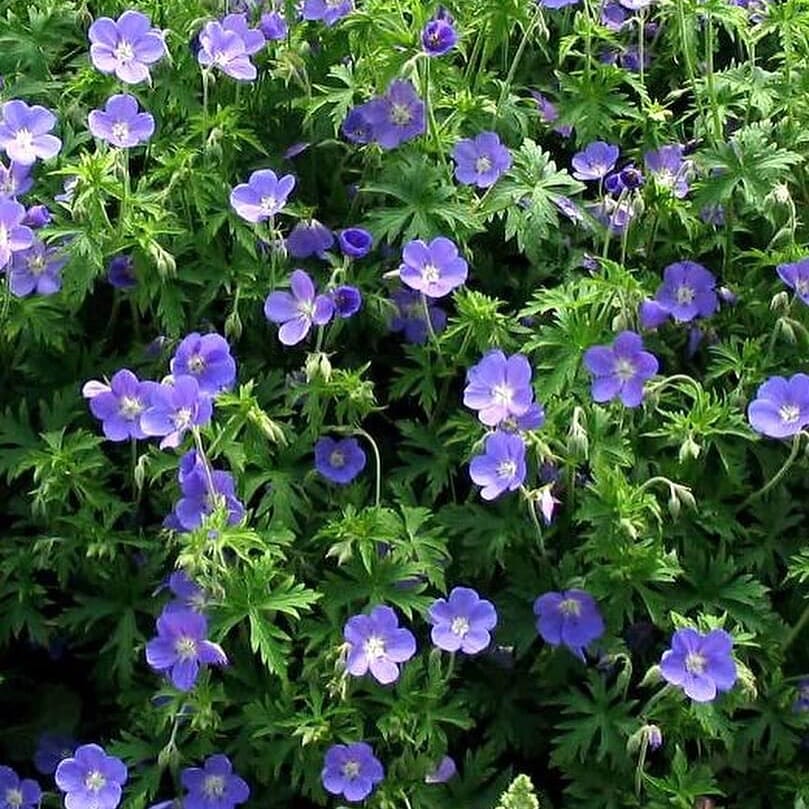 Это неприхотливое травянистое многолетнее растение, которое очень хорошо адаптируется к разным условиям. Она имеет яркие чашевидные цветки на сильных стеблях. Количество лепестков в цветке – пять. Их окраска – насыщенная сине-фиолетовая с пурпурными прожилками и отличительной темной серединкой в форме звездочки. Цветки удивительной расцветки красиво смотрятся на фоне ажурной листвы. Диаметр – 3 сантиметра.