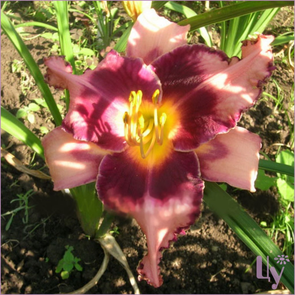 Тетраплоидный сорт, махровый, персиковые лепестки с красно-вишневым горлом и тонкой оборкой, гофрированные края, желтый ореол вокруг горла. Цветоносы высотой 70-75 см. Диаметр цветов 16-18 см. Срок цветения середина сезона. Повторноцветущий. Очень ароматный! На цветоносе 3 ветви и 25 бутонов. Тип листвы: полувечнозеленый.