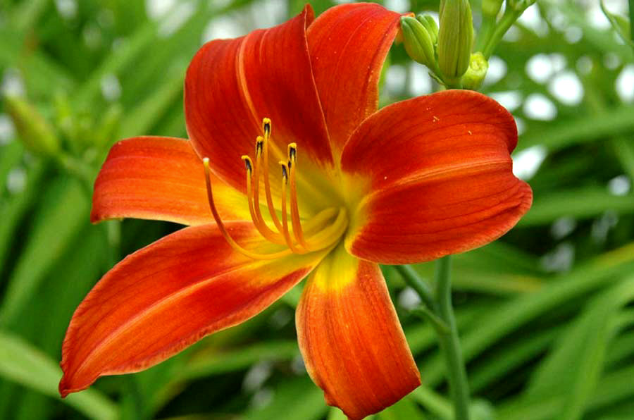 Лилейник Марокко Бьюти. Группа мелкоцветковых, однотонных. Цветки красно-бордовые, бархатистые, с оранжевой центральной жилкой, открытые, с узкими лепестками, диаметром до 10 см, высотой до 9,5 см. Зев желтый. Куст компактный, диаметр 75-80 см, высота – 70-80 см. Листья светло-зеленые. Цветоносы длиной 80-90 см, выше листвы, в количестве 18-25 на кусте. В соцветии 8-12 цветков. Средних сроков цветения. Особенности посадки лилейника: обычно, корневища лилейника высаживают осенью и весной, но если вам нужно разделить и рассадить взрослый куст, то вы вполне можете сделать это и летом; посадка на солнечном месте позволяет растению раскрыть свойства сорта наиболее полно, но если участок лилейников находится в полутени, и при этом освещается солнцем не менее 5 часов летом, то такое место тоже подойдет; проницаемые, влагоемкие и окультуренные суглинки – наиболее подходящие для посадки.