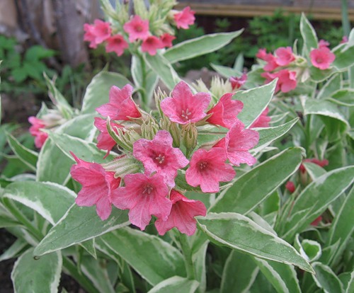Медуница красная “Дэвид Вард” (Рulmonaria Rubra ‘David Ward’). Большие мятно-зеленые листья с нежной чисто-белой каймой. Цветки кораллово-красные, яркие, смотрятся на растении очень контрастно.