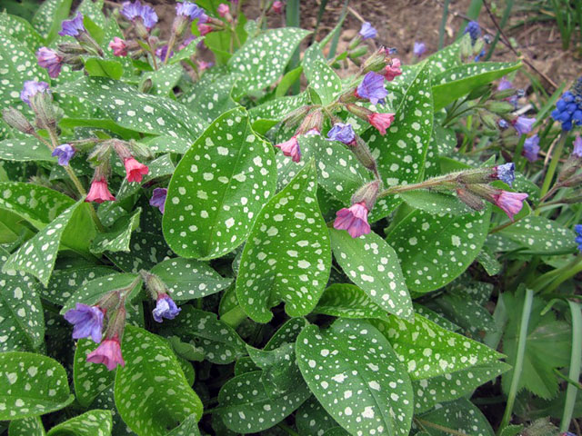 Медуница сахарная (Pulmonaria sacharata). Листья широколанцетные, белопятнистые, прикорневые – на длинных черешках, стеблевые – сидячие. Цветки собраны в парные малоцветковые завитки на верхушках стеблей. Растение эффектно до самой зимы.