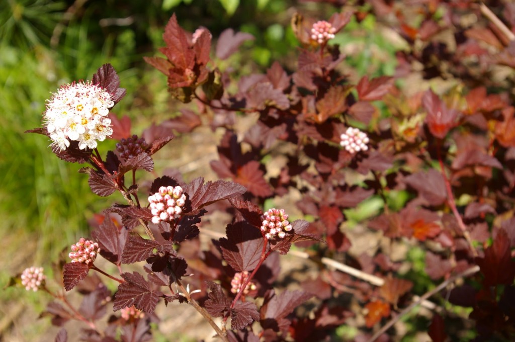 Пузыреплодник калинолистный “Самэ вайн” Physocarpus opulifolius ‘Summer Wine’ (Летнее вино) (syn. ‘Seward’) Гибрид сортов ‘Nana’ и ‘Diabolo’. От ‘Diabolo’ отличается более компактным и плотным кустом (высотой и шириной 1,2—1,8 м), ветви длинные, изящно изогнутые. Толщина веток достигает 1,5–2 см, длина составляет до 1–1,5 м. Листья 3-5 лопастные, при распускании ярко-розовые, позднее винно-красные, слегка волнистые по краям. Осенью бронзовые. Период цветения июнь-июль. Бутоны розовые, цветки розовато-белые, в щитковидных соцветиях, шириной 5см. Местоположение: солнце (полутень). К почве не требователен. Зимостоек. Зона 3.Обрезка для формирования куста на 1/3 побегов. Используется в качестве изгородей, бордюров, композиций из деревьев и кустарников, в группах с травянистыми многолетниками.