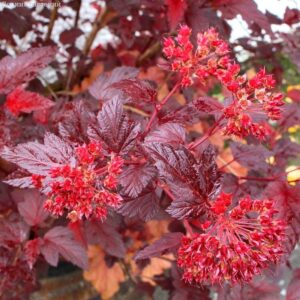 Пузыреплодник калинолистный Андре – раскидистый кустарник с округлой кроной, относится к семейству Розовые. Растение привлекает внимание своей листвой насыщенного винного цвета. Это позволяет создавать в саду цветовые акценты. Весной листья яркие, розово-фиолетовые, летом они становятся темно-красными, появляется бронзовый оттенок. Высота растения – до 2,5 м, диаметр кроны – около 2 м. Имеет многочисленные прямые побеги, которые с возрастом слегка наклоняются. Цветет пузыреплодник в первой половине июня. Мелкие бело-розовые цветки собраны в полушаровидные соцветия. Плоды красные, несъедобные. Кустарник морозостойкий, устойчив в городской среде.