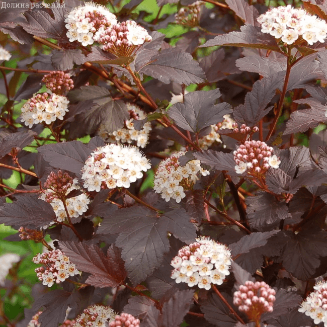 Пузыреплодник калинолистный Литл Джокер – Physocarpus opulifolius Little Joker декоративный карликовый кустарник высотой порядка 50 см и шириной около 30 см. Он считается более компактным, чем остальные пузыреплодники, но, несмотря на это, более кустистым сортом. В редких случаях высота куста может вытягиваться до 1 м. Красновато-коричневые побеги пузыреплодника Литл Джокер плотно усыпаны мелкими бордово – зелеными трехлопастными, глубоко разрезанными листьями. Ближе к осени цвет листьев приобретает более темный и насыщенный бордово – пурпурный оттенок. С наступлением июня начинается цветение, и на побегах образуются мелкие белые бутоны с легким розоватым оттенком, собранные в щитковидные соцветия. Сорт идеально подходит для создания невысоких бордюров, контейнерного озеленения. Рекомендуется посадка на освещенных, защищенных от ветра местах.