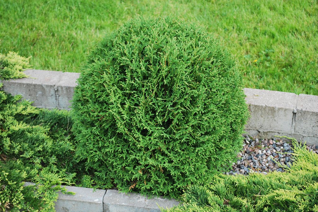 Растение туя западная. Крона шаровидная, к старости больше широкоокруглая.